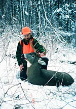 Gee, I was here on the farm and my wife took me that morning up to the foot of Middlebury Mountain. You know, Middlebury College? And the foot of the mountain and let me out there about 7 o’clock. And that old deer was in a herd. There was about six or seven does with him, so I says: My gosh, that’s an awful big deer track. I’m gonna follow it. And I did. I started right in following and I had to, of course, watch out not to spook ‘em ‘cause they’d go like that, you know. [LAUGHS.] So I followed ‘em up the mountain and I got way up on what they call Brown Mountain and I still was after ‘em. I hadn’t scared ‘em. They were still feeding along. So I just wandered around. I says, I’ve got to be like an Indian, I’ve gotta have that buck. [LAUGHS.]