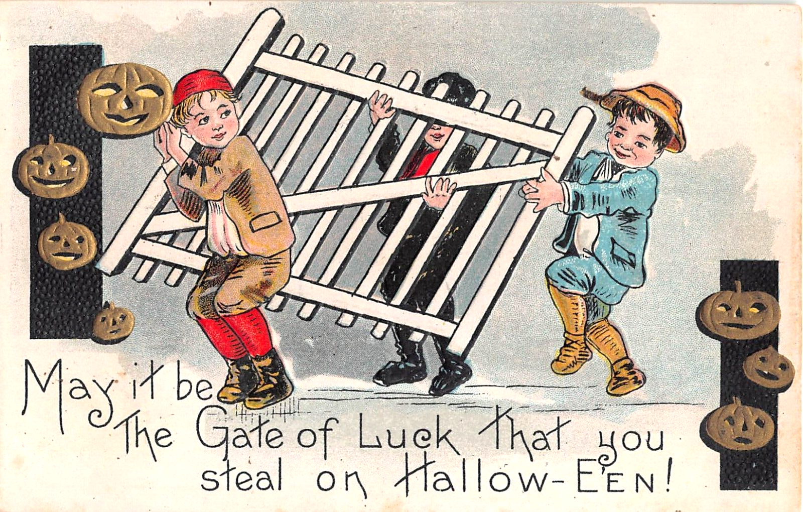 Katharine Duclos, whose story we share below, referred to the mischief (and sometimes outright destruction) kids got into during Halloween in the late 19th and early 20th centuries as Halloweening. We don’t know how widely that term was used, but we do love it, so taking a lead from Mrs. Duclos it’s our term of choice. Halloweening entailed kids playing pranks—some ultimately harmless, some annoying, some clever, some destructive and some outright dangerous—on adults and on their communities.