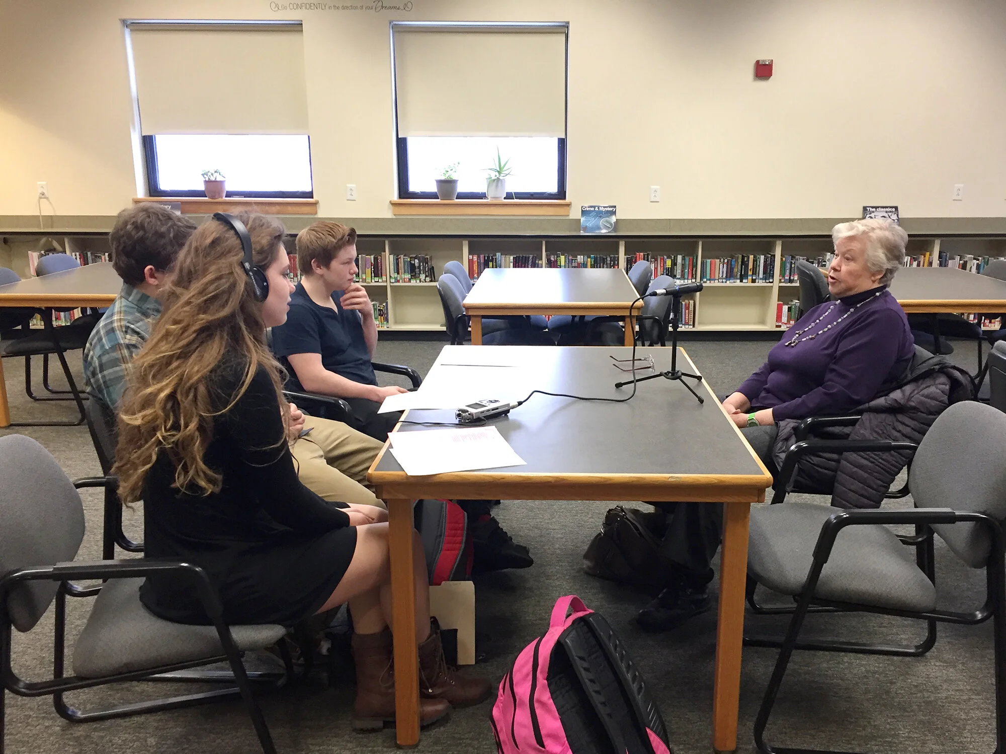 Marianne and the students introduced themselves and offered interviewees tea and coffee as they arrived at the school's library, and then the student groups set themselves up in different spaces and rooms in the spacious library for the interviews. With interviews happening all around the library, it was easy to observe the students and interviewees laughing, listening, and asking and answering both thoughtfully prepared questions and spontaneous questions: “What did you used to do when you were young and had a snow-day from school?”“Did you have any regrets in your life?” “What was it like growing up here?” “She used to go fishing with me a little bit, we used to play badminton. We went to church together.” “I worked in a one-room schoolhouse, 21 students. I was also a principal.” "I worked in a flower shop for 30 years." "What's your favorite flower?" “We, at that time, went to meet Prince Charles.” “If I was young again today… would I leave? I don’t know. The way things are in Vermont...” “Fewer farms, many cows, more milk.”