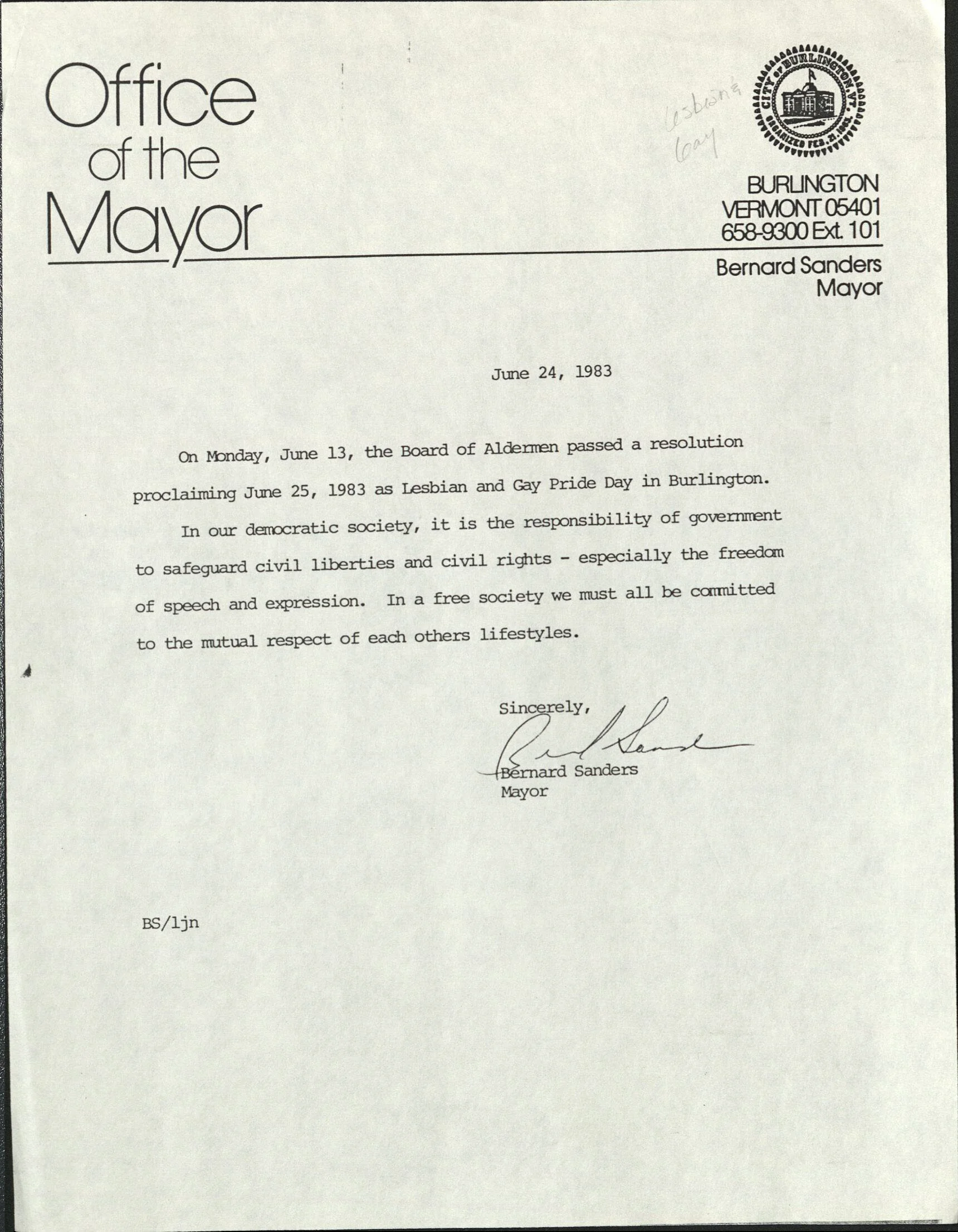 The small organizing group, including Leah Wittenberg, Lucy Gluck, Peggy Luhrs, Howard Russell, Jim Morgan, and Michiyo Fukaya, asked the Burlington Board of Aldermen (City Council) to declare June 25, 1983 Lesbian and Gay Pride Day. They sent letters to businesses and individuals asking for their support. Responses were mixed, but ultimately several businesses supported Pride publicly and the City Council made the proclamation.