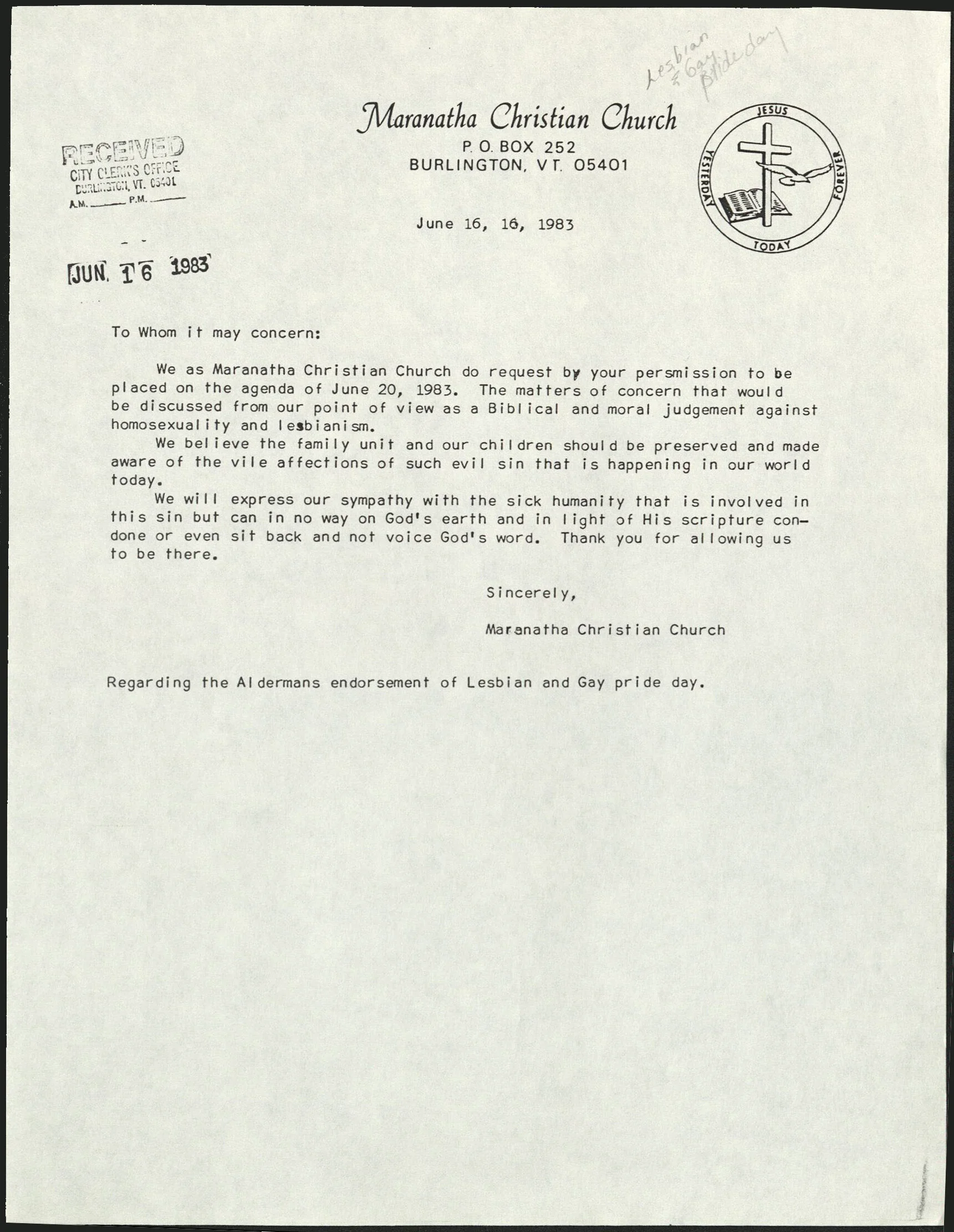 In the weeks leading up to the rally and march, indignant letters were published in local newspapers questioning the need for a Lesbian and Gay pride march. Letters in support of and against the idea of a “homosexual march” were sent to Mayor Bernard Sanders, city aldermen, and local newspapers.
